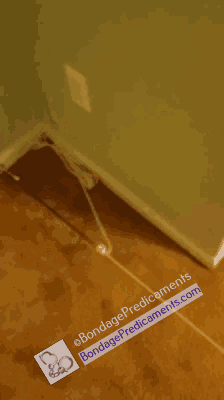 I went behind him, gave his ass a smack to further reinforce how vulnerable he was, and tied a rope around his balls. I pulled the long rope down and back until it was taut in a position where he was forced bend his knees with his ass thrusted back behind him. Then I tied the rope off, securing his position.