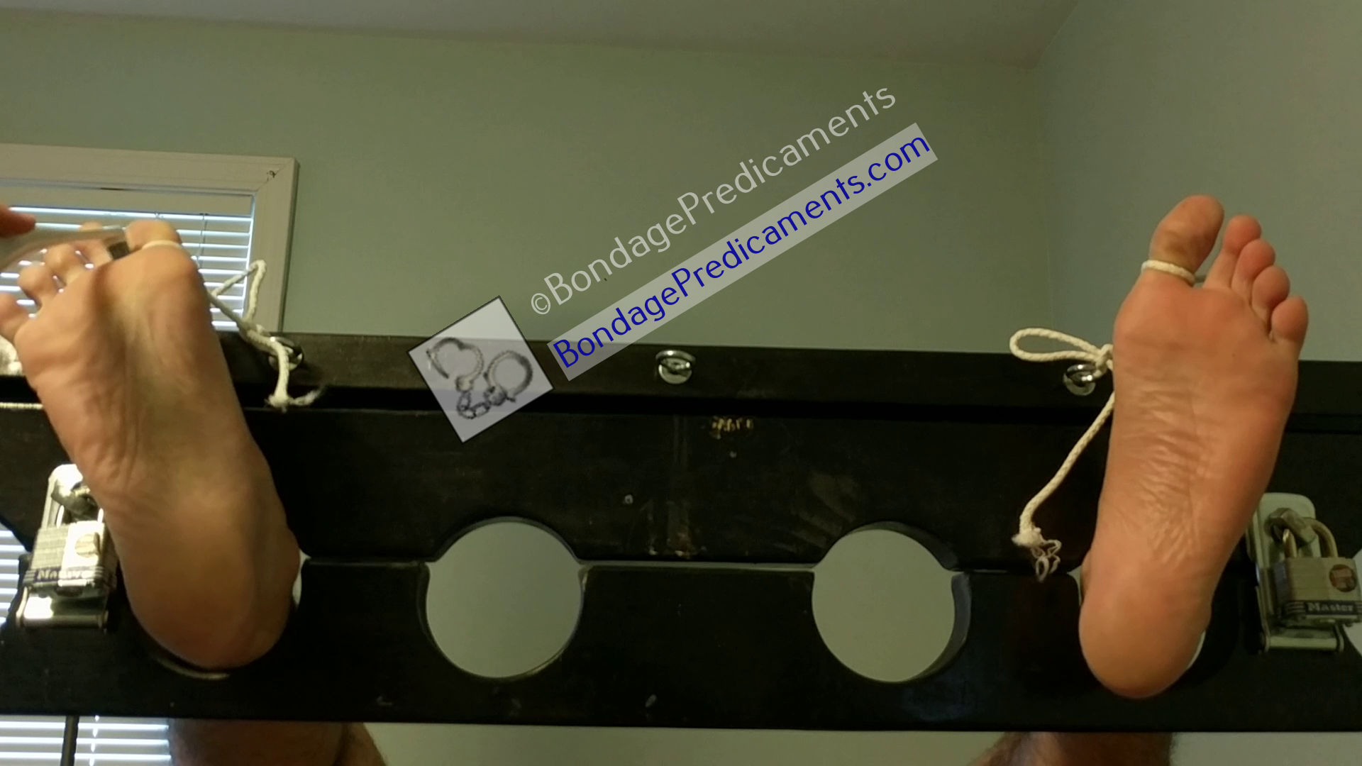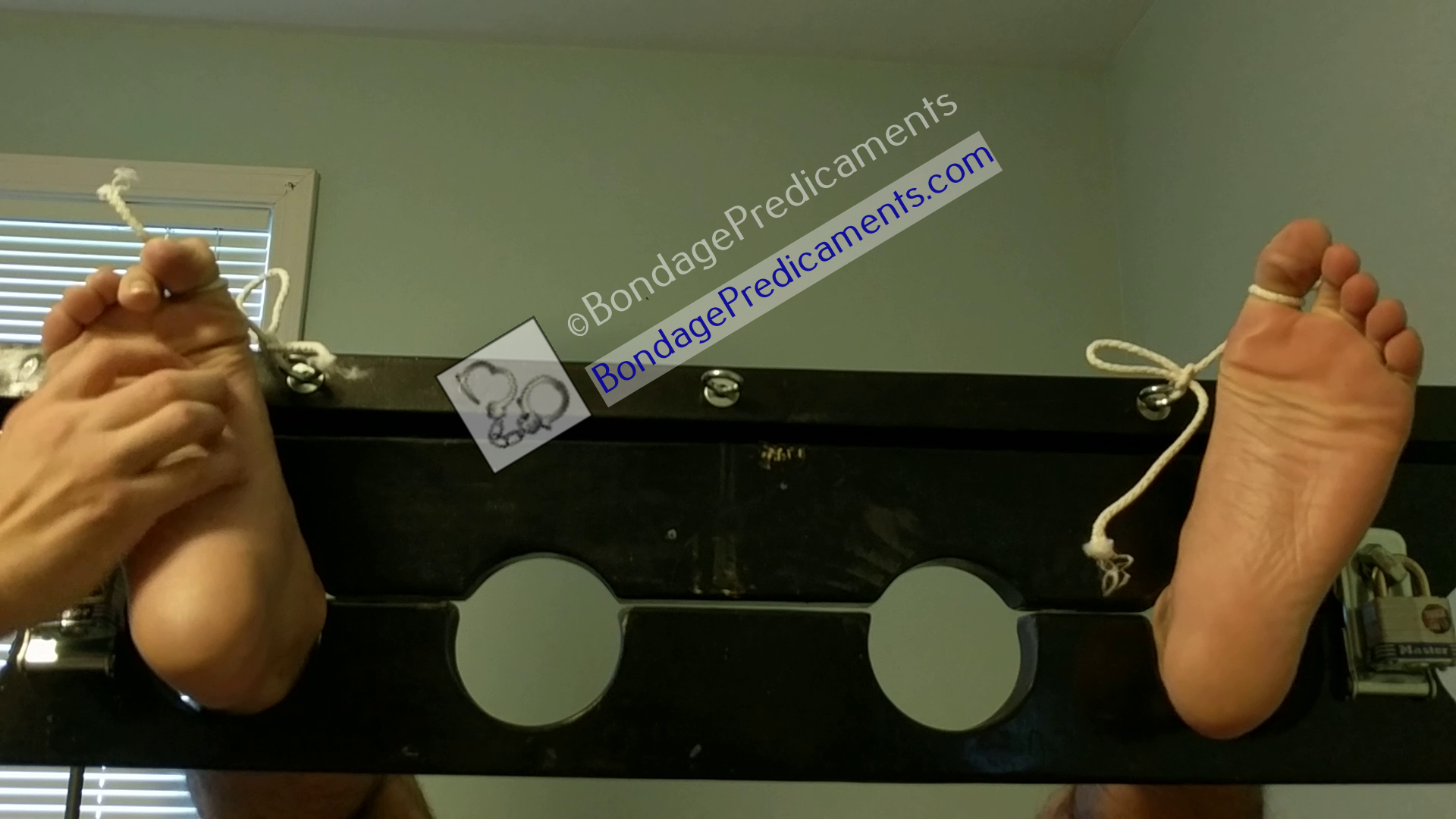 I laid this sub down on the bench suspended above the floor, then chained his wrists under the bench and locked his feet in the stocks. Since I know just how ticklish this sub is, I figured...Why waste a golden opportunity? So I took some thin rope and tied his big toes back to eyebolts in the bondage wall. Now his bare, uber-ticklish feet were exposed to whatever sadistic whims I could come up with. <evil grin!>