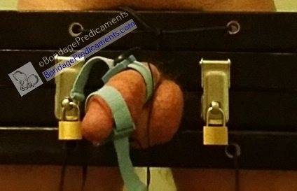 As always, make sure bdsm/kink play is safe, sane, and consensual. Never leave your sub alone during bdsm play. Prepare everything needed before restraining your sub so there’s no need to step away until after you’ve released him. When using rope or any tightly fitting cuffs, always periodically feel your sub’s hands/feet/balls (whatever is tied) to ensure they aren’t cold. Cold is a sign of circulation loss which needs to be addressed immediately by removing the restraints in that area before your sub gets hurt. With e-stim play, it’s important to know your sub and what he can handle BEFORE engaging in this type of play with a sub who is restrained, and especially if he’s gagged. Make sure he has a safe word, and a sound/hand signal equivalent if he’s gagged.