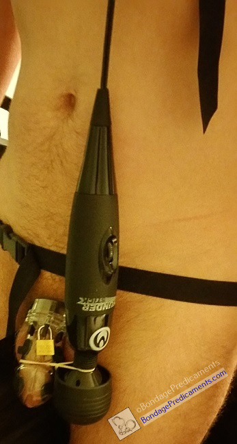Lock your restrained sub’s dick in chastity, then use rope and/or rubber bands to tie the neck of a vibrating wand to the chastity cage and turn the wand on. You can adjust the variable speed higher/lower based on how your sub responds.