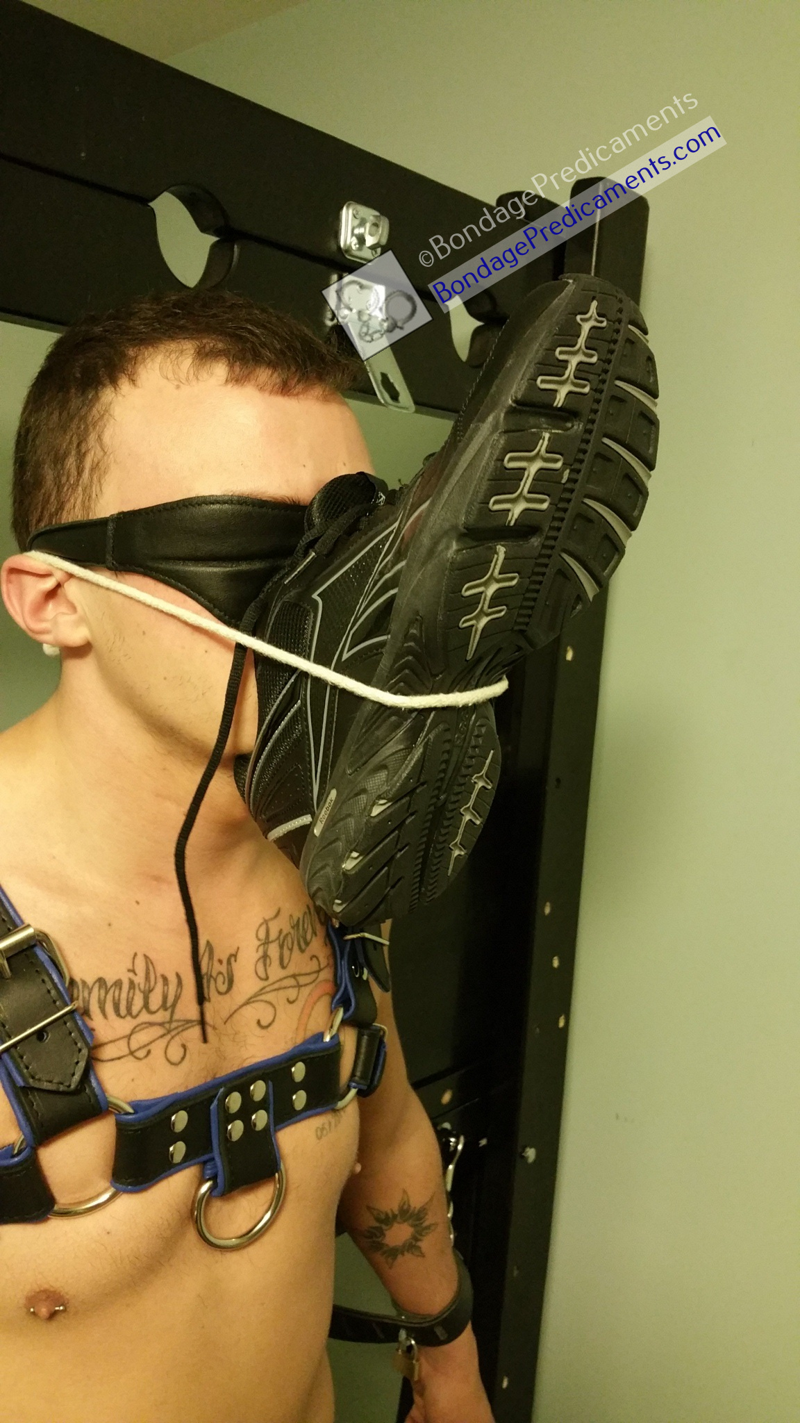 Gboy’s opinion of this gag: “The shoe gag was interesting. Again luckily the shoes didn’t smell unhygienic. So it could again be made worse depending on how brutally used the shoe is. Very interesting gag.”
