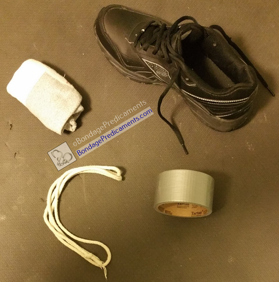 A shoe gag is another more humiliating gag (and a favorite of many subs into humiliation and/or feet). It’s also another one that’s free and doesn’t require an order from a kinky gear store, or even a trip to your local home improvement store. Just put it over your sub’s mouth and nose, usually best with the toe at the top, then use a rope to tie it. Run the rope around the back of his head and tie it in place. Or, you can use duct tape for a more secure, long lasting, “no way out” hold. If your sub needs to be punished, maybe go for a 1-2 mile run in the sneakers first, then use one of them as his gag right when you get back. Just be sure not to leave your sub in bondage while your gone (maybe locked in chastity, but not restrained otherwise).
