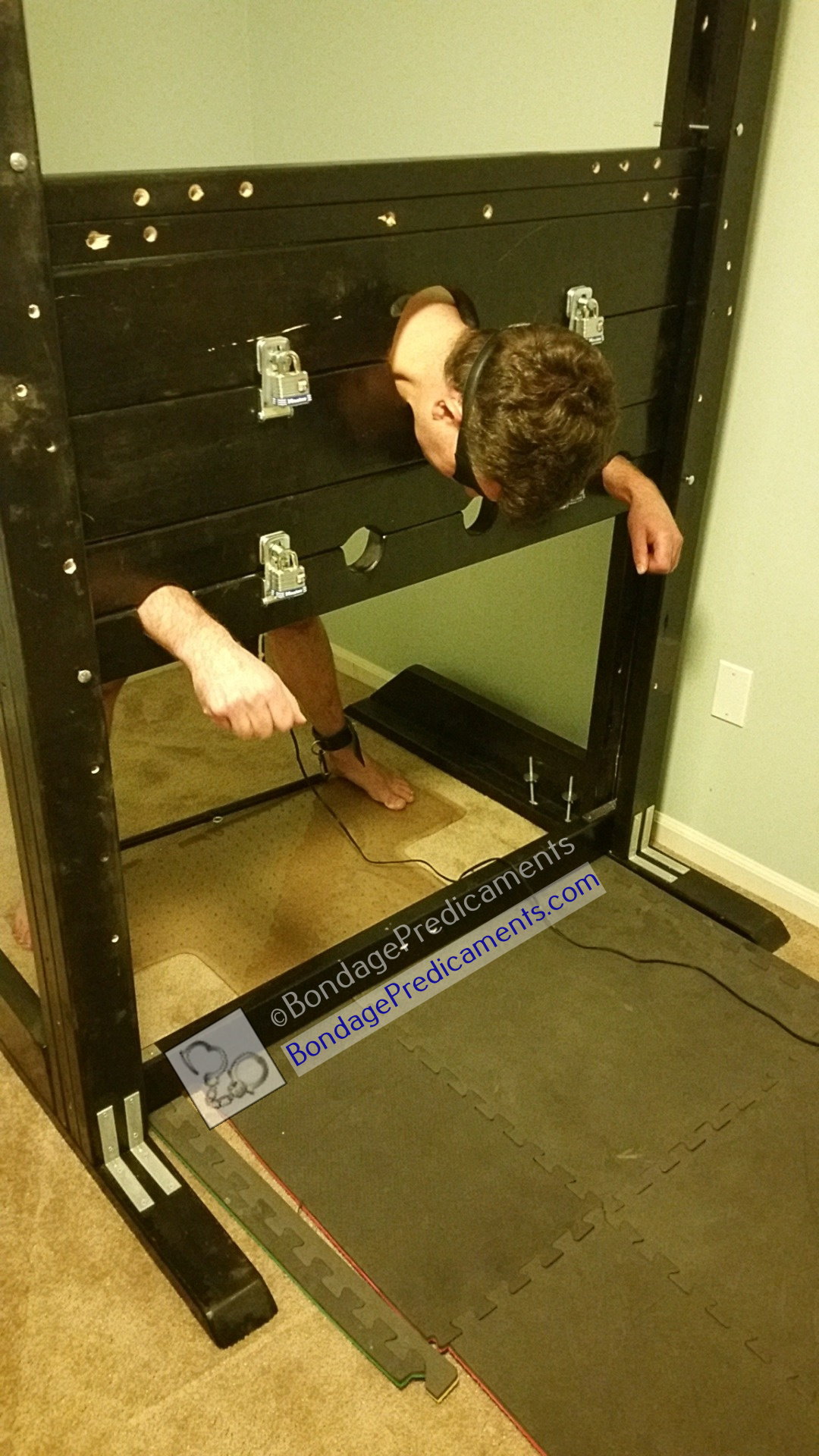 Enjoy the next few hours, boy. You’ll be kept like this until I see a large puddle of pre-cum on that spiked mat. If I don’t see enough pre-cum in an hour, I’ll tie your balls down to the eyehook in the spreader bar, forcing you to keep your knees bent until I see enough pre-cum. Oh, and if you find some way to cum in that chastity cage, you’ll remain like this until you cum 2 more times.