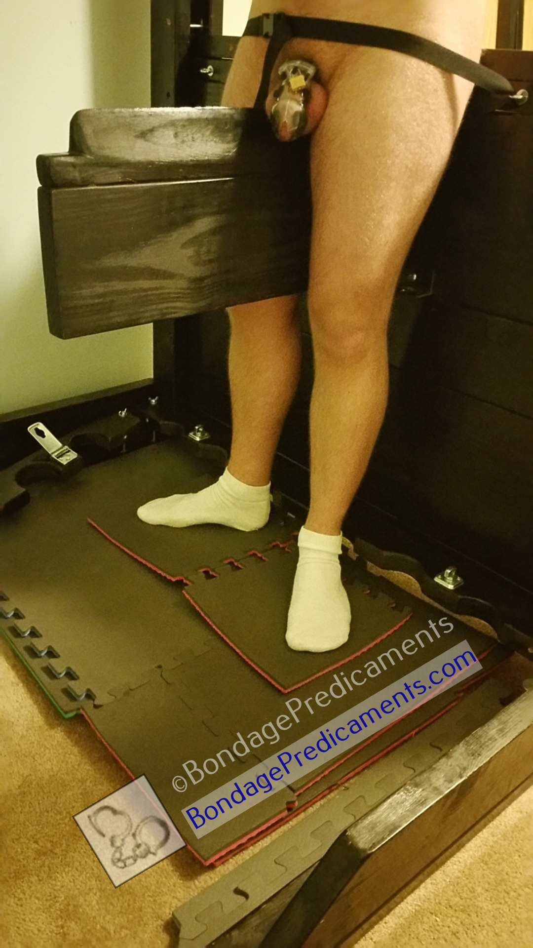 He wasn’t quite feeling the wooden horse to it’s full effect. So I decided to remove one of the 3 layers of mats. Then I removed his socks, to make the surprise I planned more effective. He was still looking a bit too comfortable. I certainly didn’t want him falling asleep on me, so I removed another layer of mats. That got his attention. His hands cuffed up high were getting a bit cool, so I brought them down where he could rest them on the bondage wall (circulation is a good thing!). I also cuffed them so they were just out of reach of his caged cock. At this point it was pretty much filling the cage. There were slots where he could’ve touched it, stroked it, pleasured it…something it so greatly desired at this point. If only he could reach it…but I locked his hands in a way that left them mere inches from his cock. Check out the pic above where he’s trying to reach his cock…oh sooo close! <evil grin>