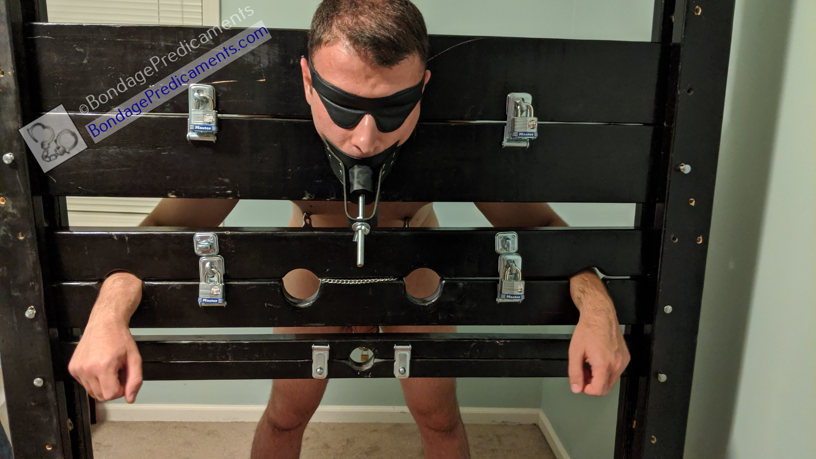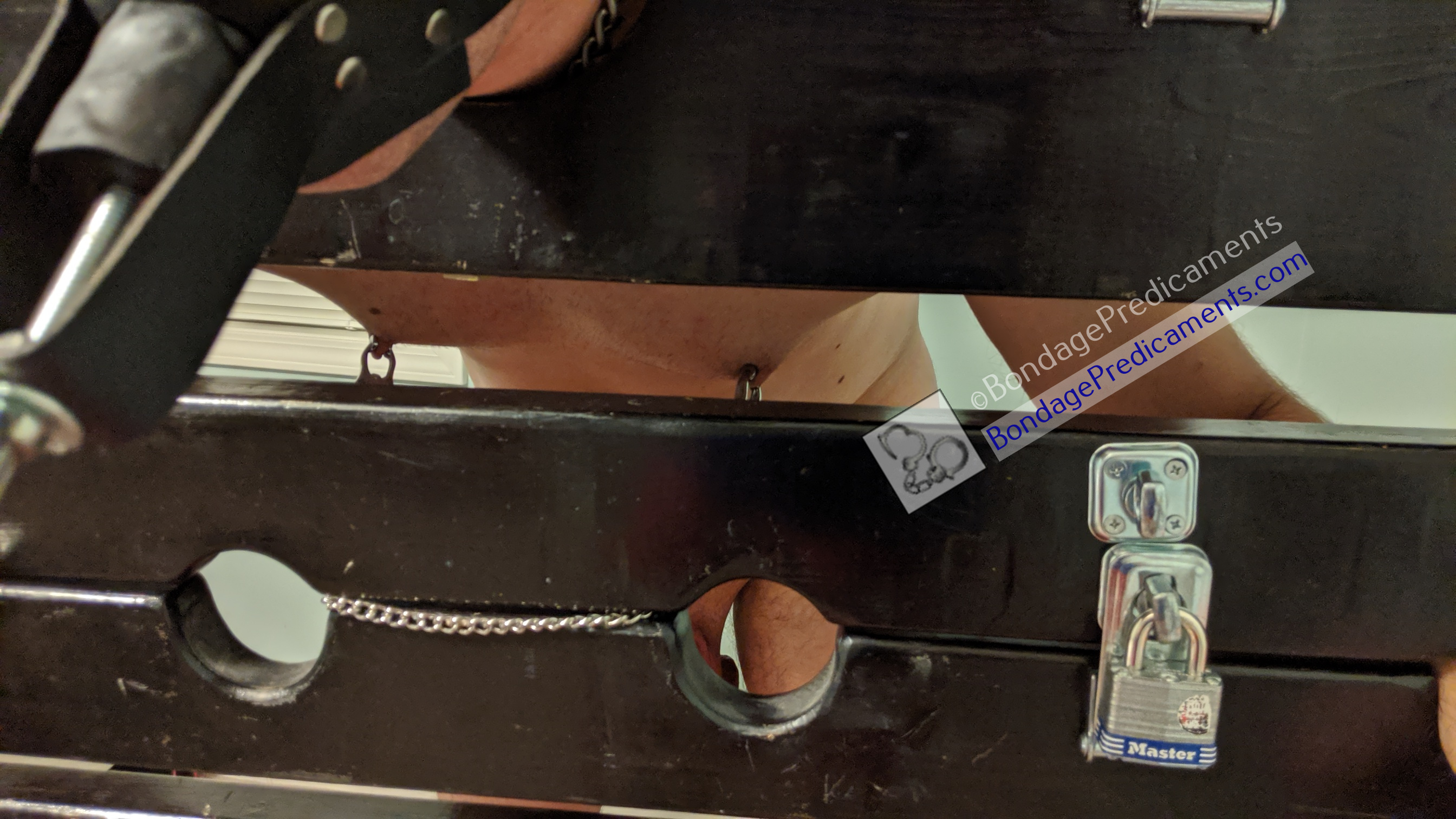 I wrapped the string between the Velcro nipple clamps through the wrist holes in the stocks just like before, but the string was much longer than the clover clamps chain. So I stretched the string even further down, forcing him once again to make a choice: A. Lean even further into it, which his back and probably abs would eventually hate him for, or B. Deal with the extreme stretching of the nipple clamps. And this time, well...if you've never felt Velcro clamps trying to pull off of your nipples, trust me, you don't want to! ;-) So he chose option B, once again, as his cock continued struggling in the confines of the steel chastity cage that I had previously locked it in.