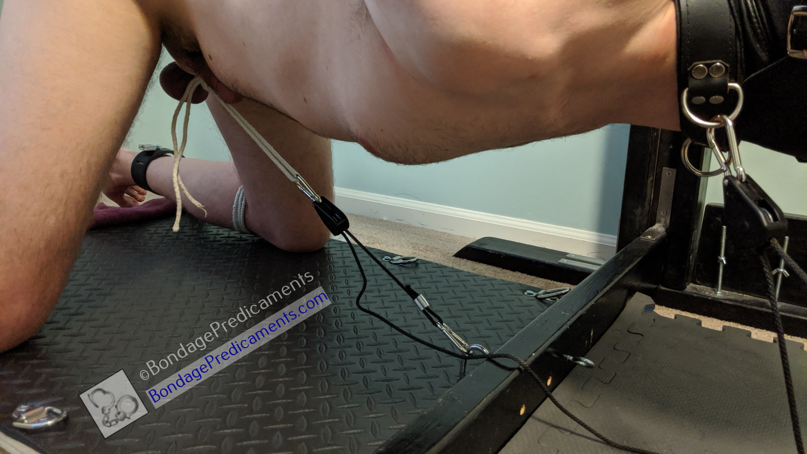 I quickly clipped the ratcheting ropes that I had in place to D-rings on either side of his collar, and another to his tied balls. Now he couldn't move his head further back, or to either side since I had his collar tethered out to both the left and right sides in front of him. And his balls...well they weren't going anywhere either. Yep, at this point, he was fucked. Just figuratively fucked at this point. I believe I had threatened, or at least made sure he acknowledged the fact that I could pull out the fucking machine at any point and very EASILY have it violate his vulnerable hole repeatedly for hours if I chose to. <evil grin!>
