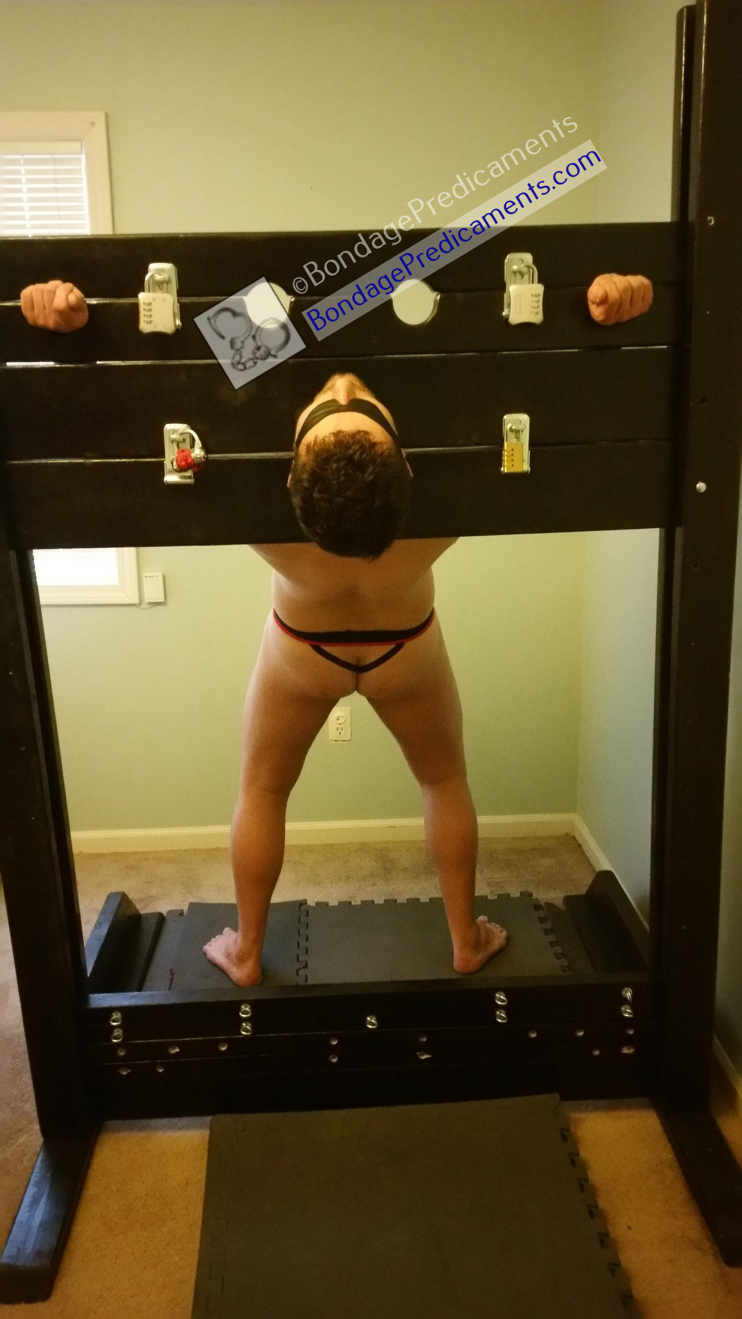 Sometimes locking a boy in the stocks the traditional way can get kinda boring. So this time, I added a little twist…arched backwards and facing up with head and hands locked in. Add nipple clamps and a shoelace tied from the head of his hard dick to the chain so it tugs on the nipple clamps when he gets hard, which I’m helping along with a vibrating wand. If he doesn’t like it, all he has to do is not get hard, right? (Not like I was going to make it that easy.) As you can see from his rock hard dick, he “hated” it. ;-) He wanted a challenge, and he got it!