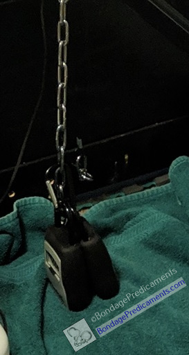 I can't be sure but to me it looks like the weights holding down his balls are more or less resting on the towel. I think while they are "at rest" he is sitting quite hard on the wedge and the dildo is somewhere up his ass. To get relief he has to straighten up on his tip toes but that would be painful on his balls as those lock boxes will probably be full of something. Also he has to keep his legs apart on those stools for obvious reasons.