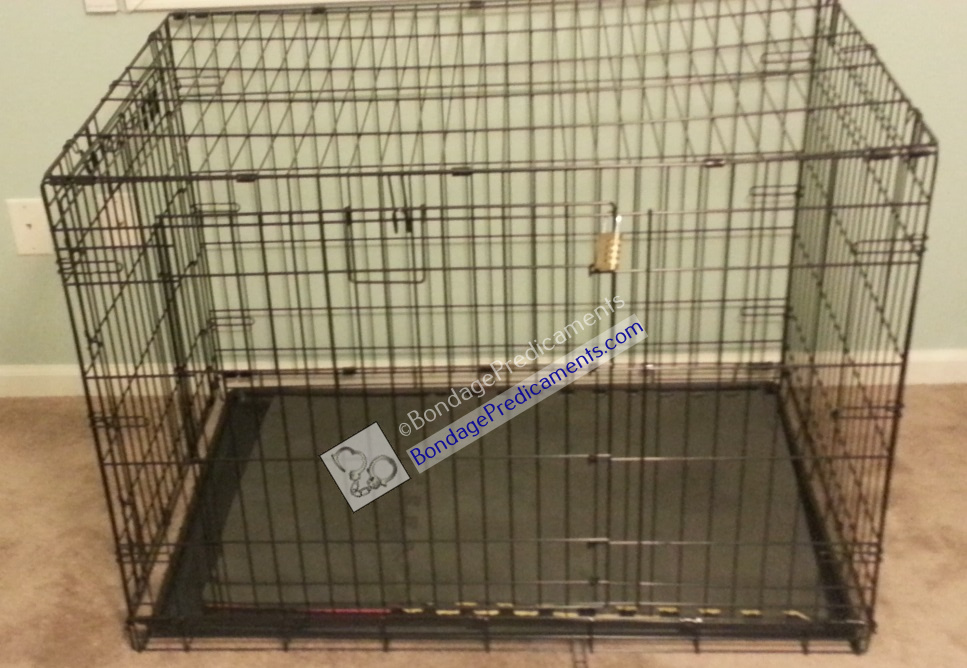 This week, you’ll see how you can take a dog cage that you may have in storage and turn it into something that can completely immobilize your sub. I don’t just mean keeping him in the cage by using a few padlocks, free to move around the cage. I’m talking as immobile as you want him while he’s in there. No need for an expensive pipe rack or anything that requires an entire room to use or store. This will produce a very similar result. When you’re done, just collapse the cage, slide everything under the bed, and it’s out of plain sight.