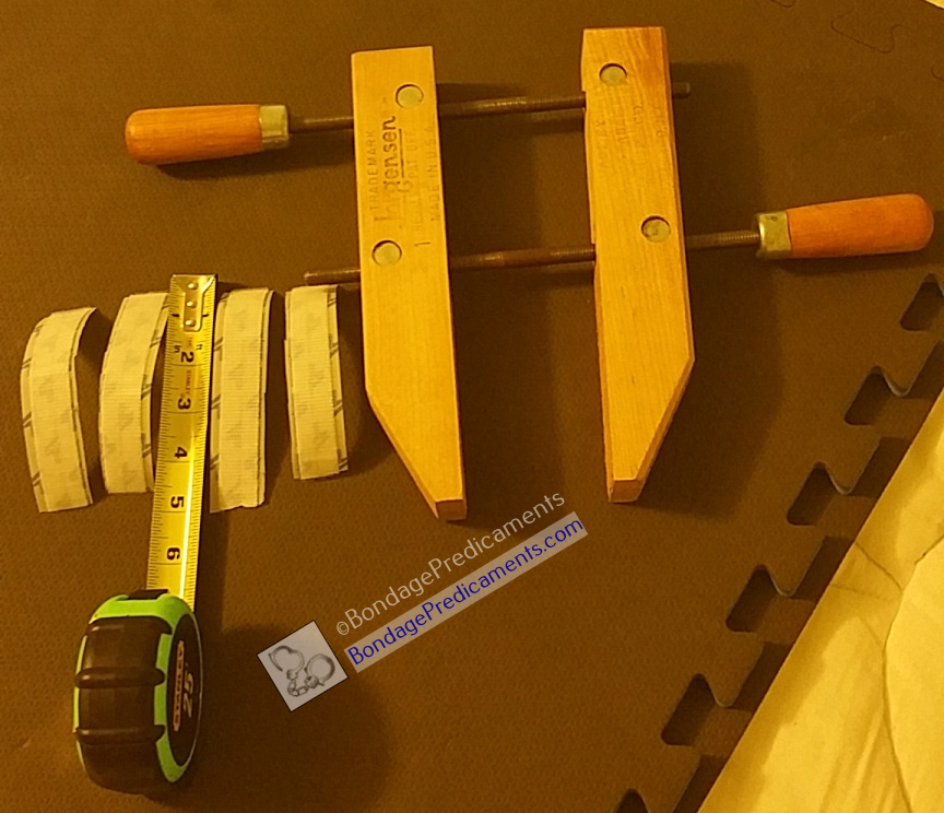 Peel the backing of one velcro strip and place it in the area of your wood clamp that you previously measured, from the end all the way to the first screw. Be sure the long side of the strip is as close to an edge as possible. Repeat with a second strip on the same side of the clamp, and 2 additional strips on the other side of the clamp. See the photo below for an example. Make sure all of the velcro strips are on securely, and it's probably a good idea to let them sit for a while with the clamp left open before closing the clamp.